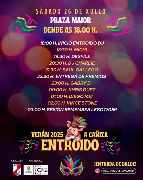 El Concello invita a vecinos y visitantes a disfrutar de una jornada festiva pensada para todos los públicos, con propuestas culturales, lúdicas y musicales que refuerzan el papel del Entroido de Verán como motor de dinamización social y económica en A Cañiza.