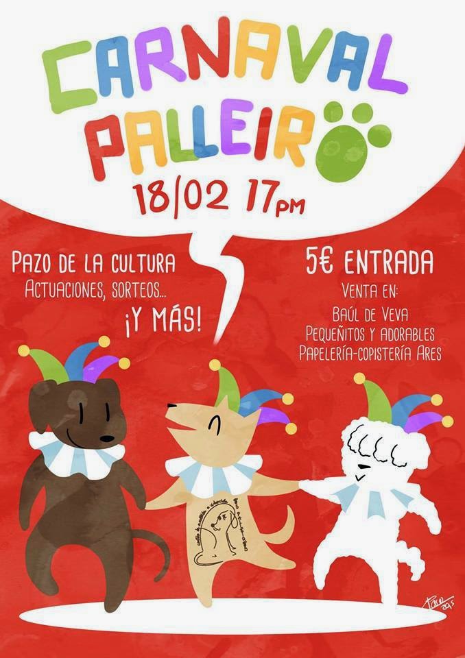 - La protectora de Animales «Os Palleiros» organiza una fiesta de Entroido con varias actividades para pasar una tarde divertida. Con las actuaciones de Pinga Teatro y de la Escuela de Danza Media Punta (Vigo). Habrá pinturas, música, sorteos…