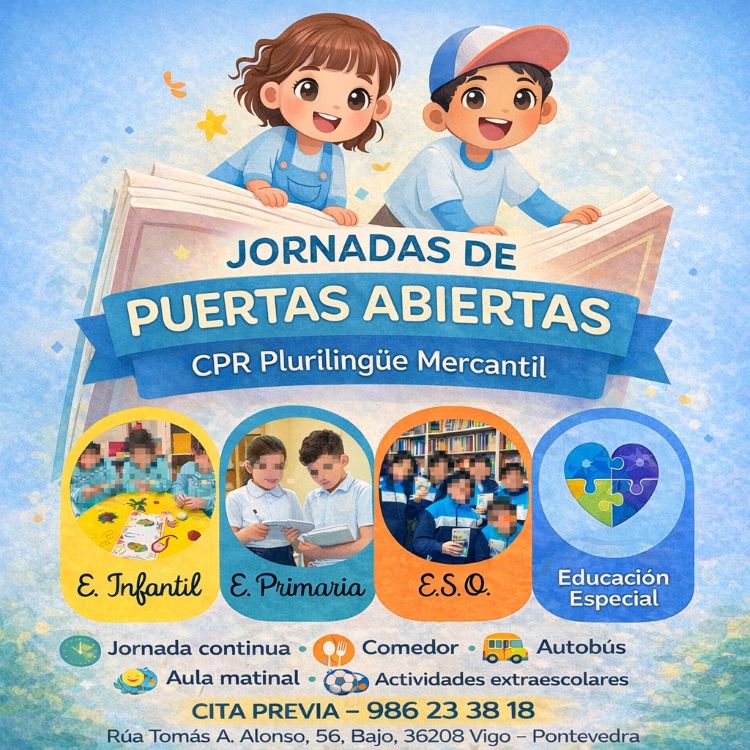 Cuando una familia desea conocer el colegio, el CPR Plurilingüe Mercantil lo pone fácil. Para las jornadas de puertas abiertas solo es necesario llamar al 986233818 y solicitar cita. El centro recibe a las familias con calma, les muestra sus instalaciones, les explica su forma de trabajar y resuelve cualquier duda de manera cercana y personalizada, fiel a su forma de entender la educación y el acompañamiento.