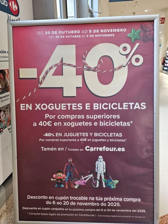 Muy fácil realizas tu compra de juguetes y bicicletas por importe igual o superior a 40€ del 30 de Octubre al 5 de noviembre  y te darán un cupón que podrás canjear del 6 al 20 de Noviembre en tu próxima compra en Carrefour.