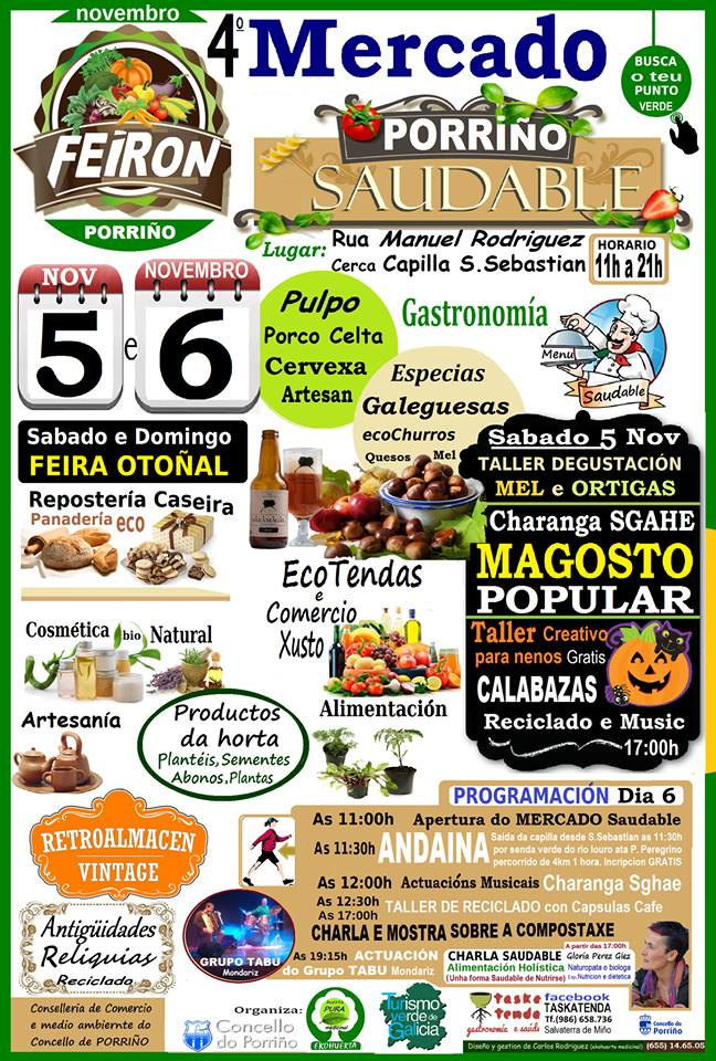Si hablamos de mercados interesantes en Galicia surge el nombre de Carlos Rodriguez, un seguidor de Vigopeques que puntualmente nos informa de todo, no siempre tenemos tiempo de publicar todo lo que él nos envía pero hoy quería hacer una entrada del mercado saludable que ha preparado para este fin de semana. Será en Poriño, el sábado 5 y el domingo 6.