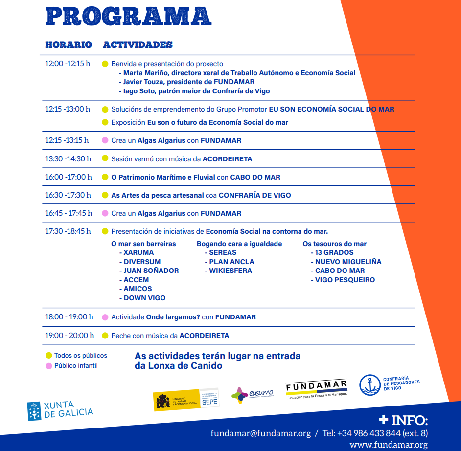 Esta iniciativa, desarrollada en el marco del proyecto «SOY LA ECONOMÍA SOCIAL DEL MAR» , liderado por la Fundación FUNDAMAR , en colaboración con la Cofradía de Pescadores de Vigo ️, y gracias al apoyo de la RED EUSUMO, la Xunta de Galicia y la Diputación Provincial de Pontevedra promete un día lleno de actividades para toda la familia.