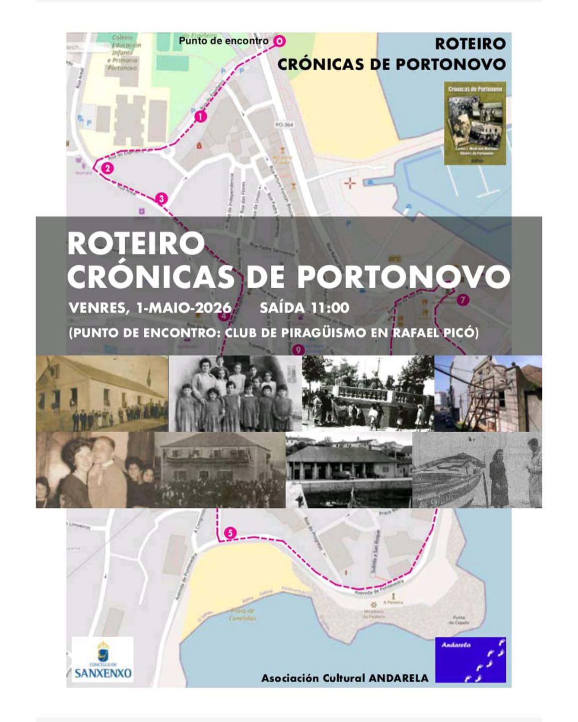 • Bajo el nombre de «Portonovo Gastronómico», el programa arranca el viernes 1 de mayo a las 11:00 horas con una ruta por las crónicas de Portonovo, organizado por la Asociación Andarela desde el Club de Piragüismo. Se trata de una propuesta para descubrir la historia del pueblo de forma única y participativa.