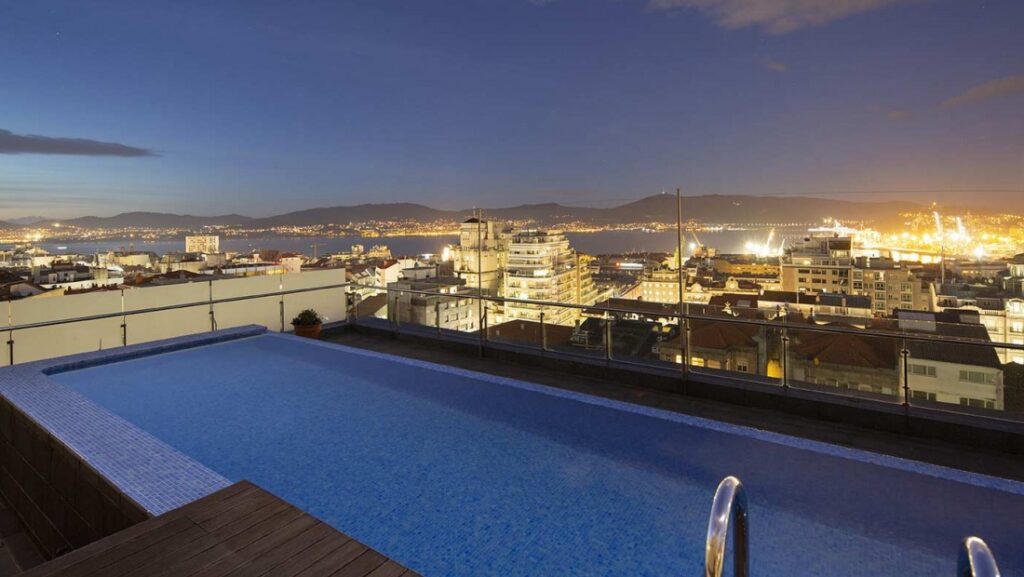 Este hotel de 4 estrellas está ubicado en la calle María Berdiales, en pleno centro de Vigo, entre sus secretos más preciados es que cuenta con una pequeña piscina de borde infinito en la azotea.