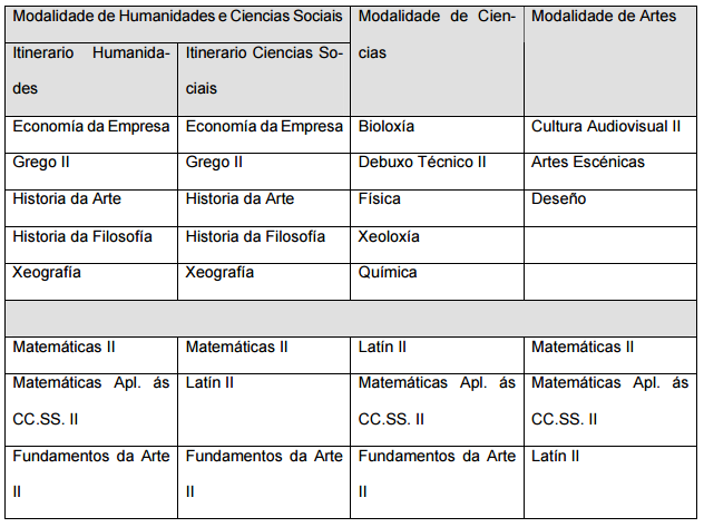 En el caso de haber cursado el itinerario de Humanidades, la esta lista habría que sumar Latín; en el caso del itinerario de Ciencias Sociales, Matemáticas Aplicadas a las Ciencias Sociales; si la modalidad escogida es Ciencias, Matemáticas; y si fue Artes, Fundamentos del arte.