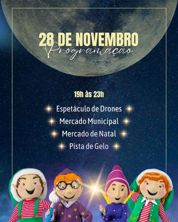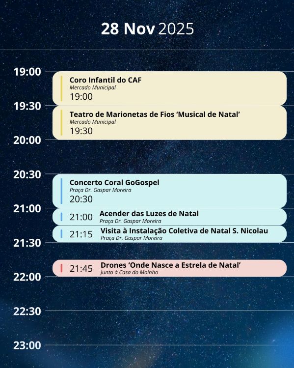 La programación de Navidad en Santa Maria da Feira comienza a las 19:00 del 28 de noviembre con el Mercado de Navidad, el carrusel y la pista de hielo ya en pleno funcionamiento. A la misma hora, el Coro Infantil del CAF actúa en el Mercado Municipal, seguido de un espectáculo de marionetas de hilos del titiritero feirense Rui Sousa. La animación continúa a las 20:30 con la actuación del coro GoGospel en la Praça Gaspar Moreira, junto al Ayuntamiento, donde se ha instalado un imponente árbol de Navidad visitable de 16 metros de altura y donde tendrá lugar, a las 21:00, la simbólica cuenta atrás para el encendido de las luces de Navidad.