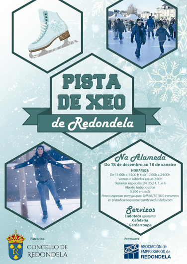 A partir del 18 de Diciembre se abrirá la pista de hielo de Redondela, se dice que es la más barata de Galicia, su precio será 5,50 euros la entrada pero que saldrá casi a mitad de precio, 3,5 euros una hora, si compras en el comercio de la zona. Así que sale a mitad de precio que las pistas de Pontevedra y Vigo.