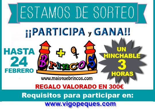 Pues esta semana el sueño se puede hacer realidad con el sorteo de un hinchable que nos ofrece la empresa Máis que brincos. “Máis que Brincos” es una empresa gallega cuya actividad principal es la animación infantil y el alquiler de hinchables en Galicia, también ofrecen espectáculos de payasos y magos, la siempre refrescante fiesta de la espuma y una amplia gama de talleres con variedad de materiales y dificultades para adaptarse a todas las edades. Ofrecen servicio de animación para Comuniones en Vigo, Pontevedra y Orense. Y para que puedas aprovechar esta oferta tanto para Cumpleaños como Comuniones tendrás un año para canjear tu regalo.