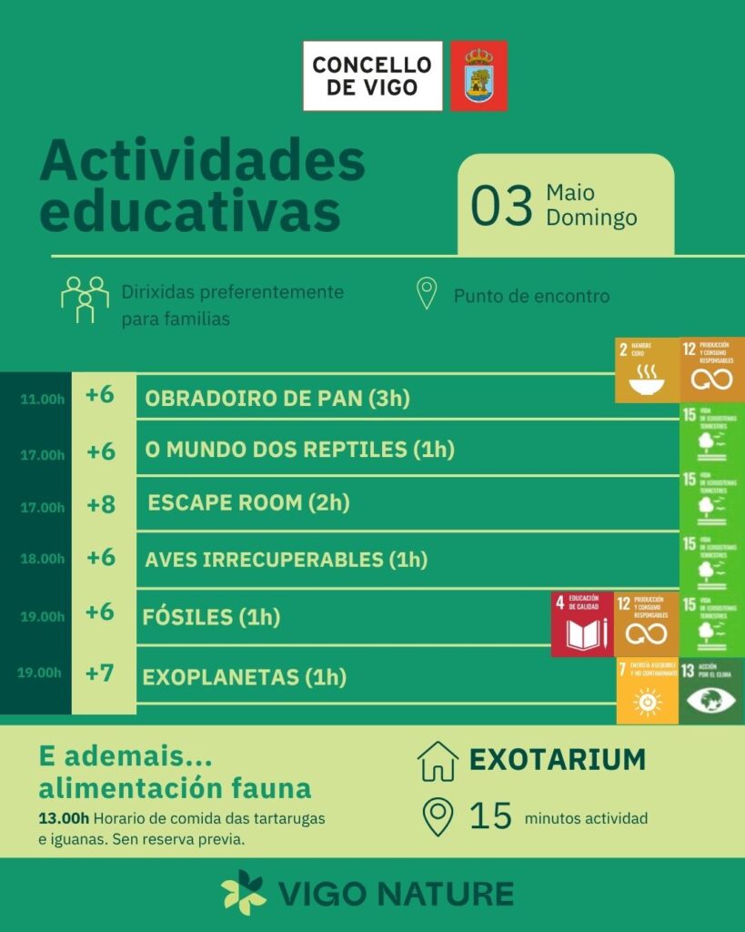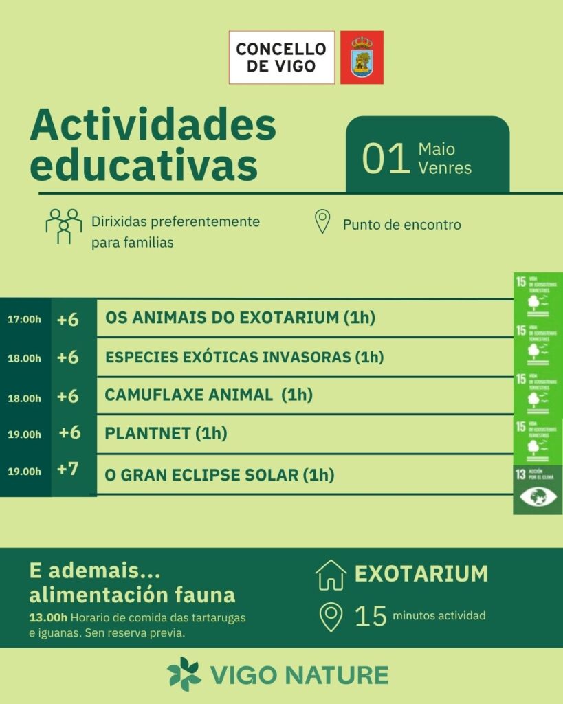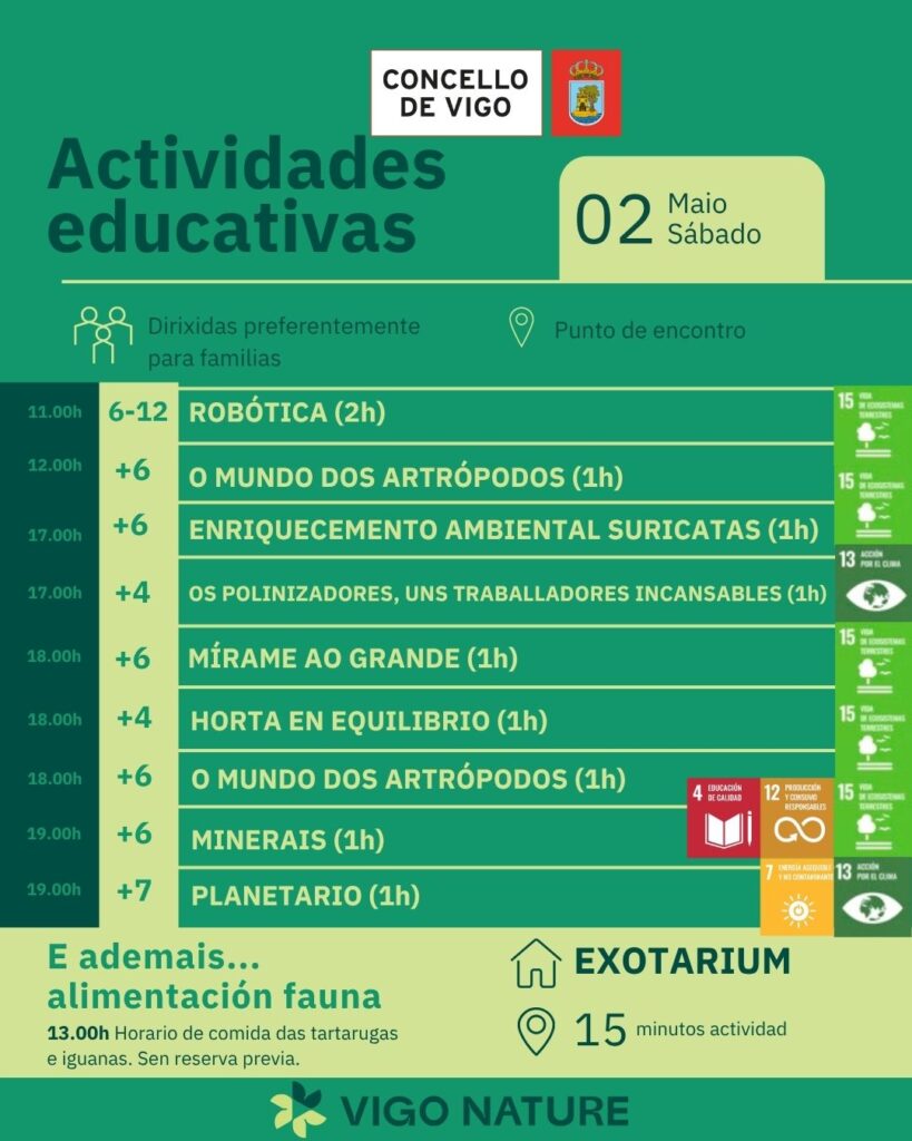 Vigo Nature ofrece actividades que combinan ciencia, naturaleza y entretenimiento. Ofrecerá una programación ampliada, especialmente pensada para escolares de Primaria y Secundaria, con talleres dedicados a energías renovables, flora y fauna autóctona, especies invasoras o aves irrecuperables.