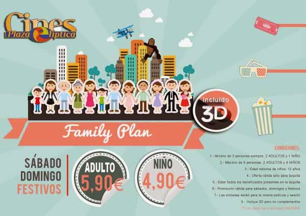 - Fines de semana: Tienen el Family Plan, adultos a 5,90 € y niños 4,90 €. A diferencia de los cines Yelmo en estos cines si es obligatorio que dos de los componentes sean adultos, el mínimos son 3 personas, 2 adultos y 1 niño y el máximo 2 adultos y 4 niños. La edad máxima 12 años y no es válida para películas Warner.